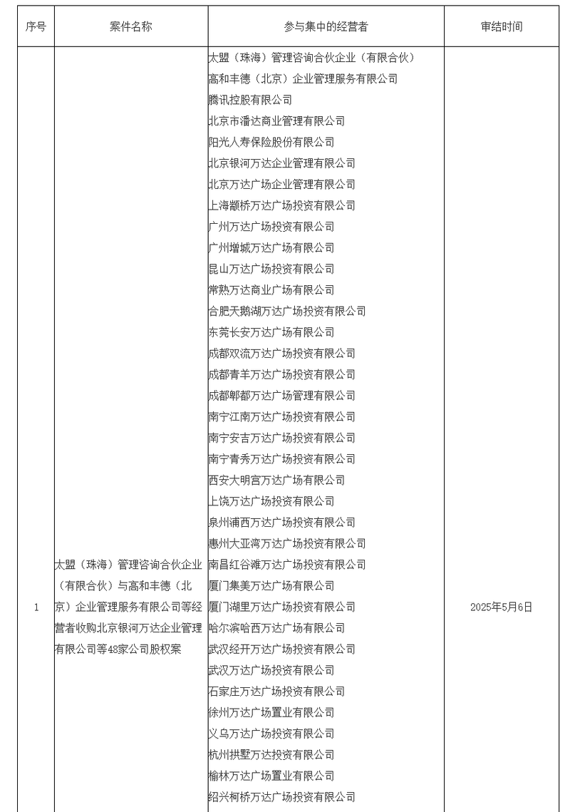 据国家市场监督管理总局网站近日信息显示,已批准太盟珠海、高和丰德等经营者收购北京银河万达企业管理有限公司等48家公司股权案。